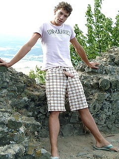 Cute twink Franky busts a big nut outdoors.