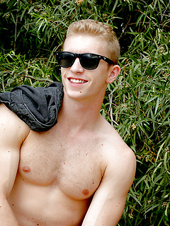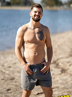 Sexy Keiran poses on a beach before going inside and revealing his big cock