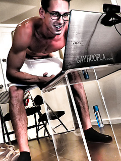 Handsome Hayes strips on a couch and jerks off his big cock while working out