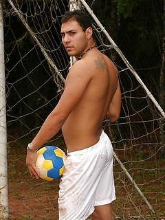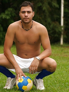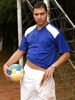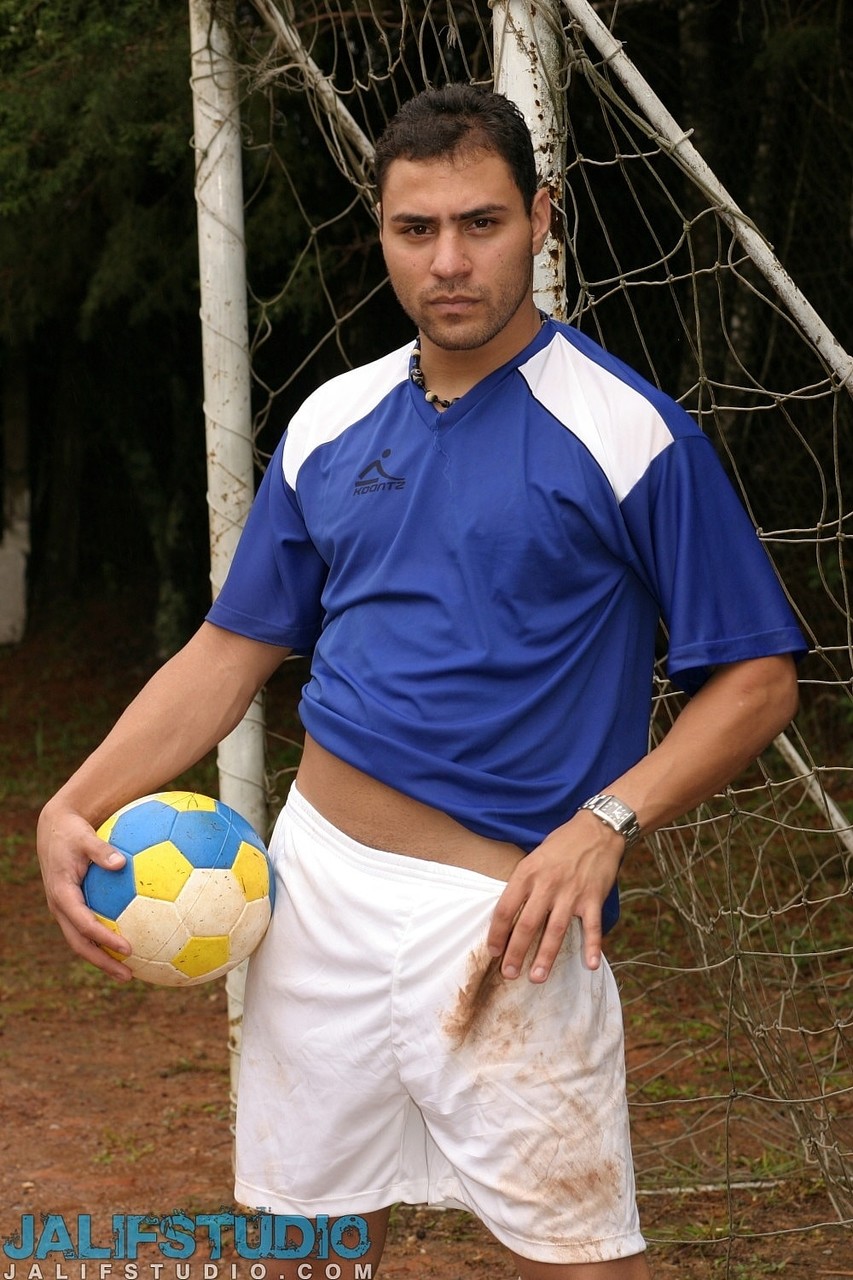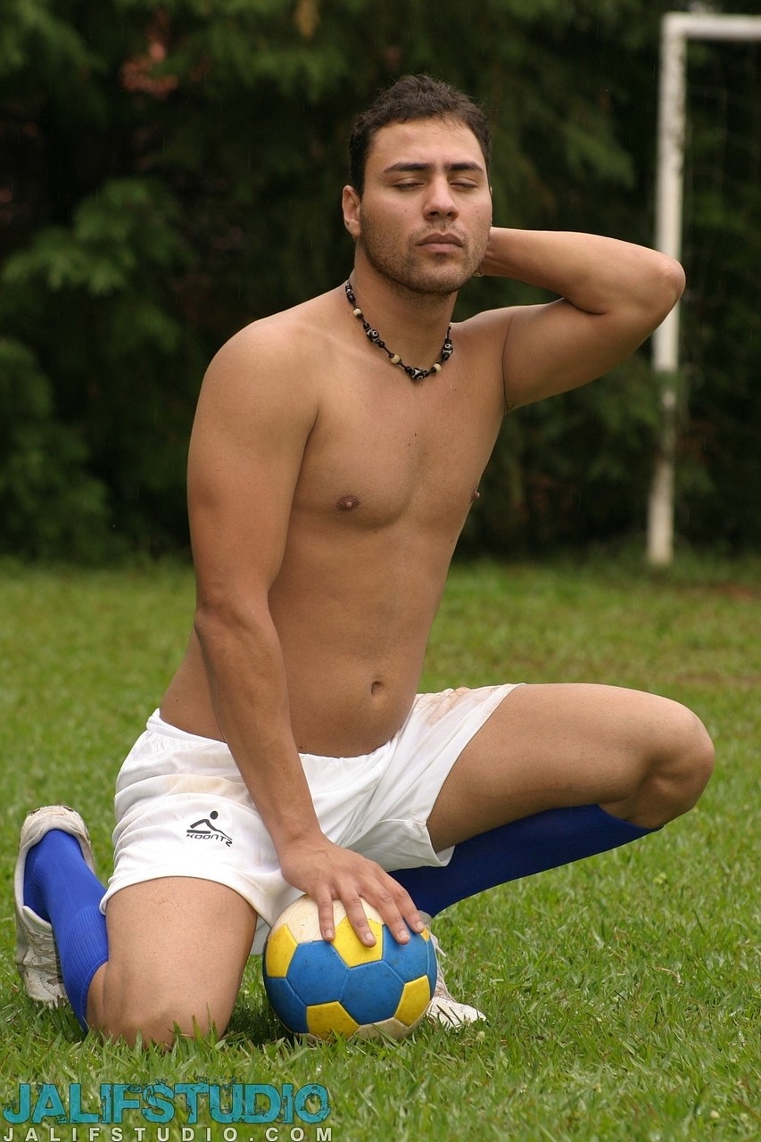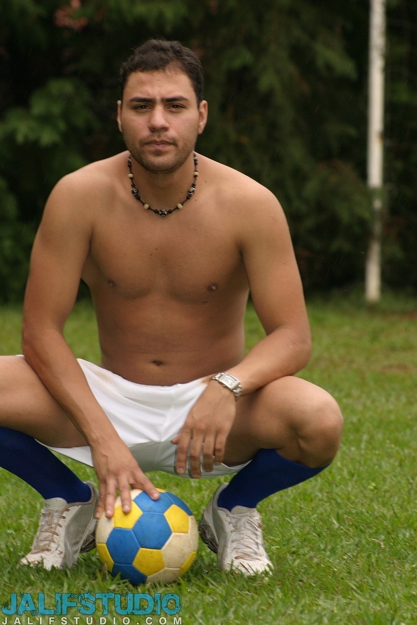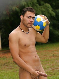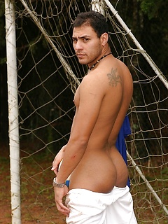 Gay soccer player strips fully naked & jerks his erect dick on the field