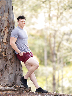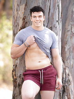 Hunky gay bodybuilder Clark Reid flashes his ass outdoors before posing naked