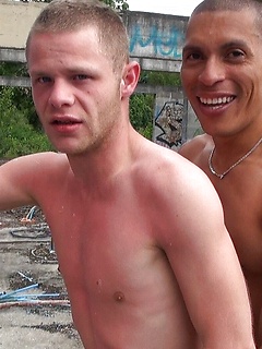 Sexy gay dudes Martin Claus and Rod Malek bang doggystyle outdoors