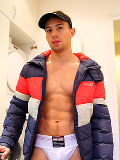 Muscle boy Cristopher Garcia slips out of his jockstrap