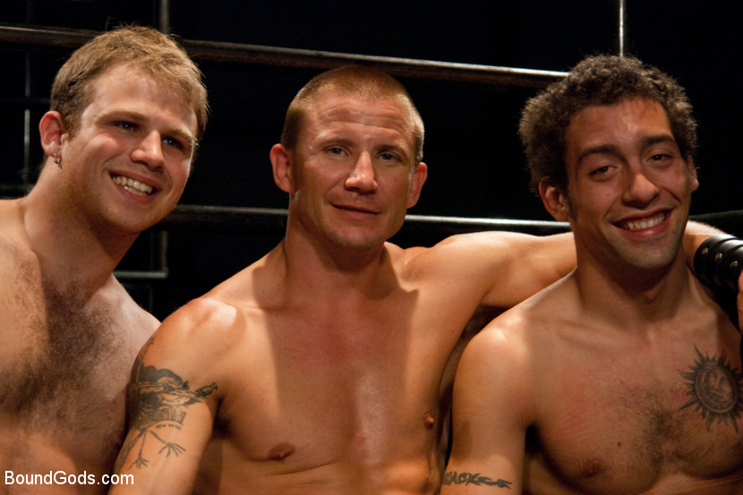 Brenn Wyson ties up two stud in leather hoods and fucks the cum out of them.