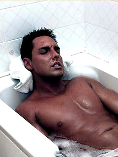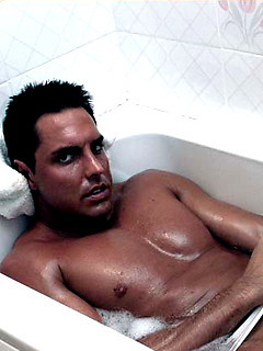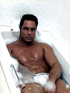 Marcello gets wet in the bath as he wanks his big cock