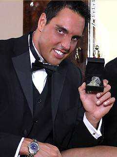 Marcello takes off his black suit and fills a condom with warm cum for one lucky fan