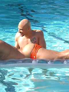 Hot muscle studs Alex Fuerte, Fredrick Ford and Ricky Martinez have fun in a pool