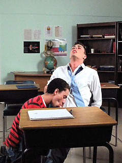 Two brat twinks hold a big dick contest in class and suck each other off