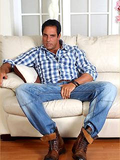 Marcello is wearing a checked shirt and playing with his hard cock