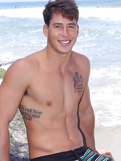 Hard bodied Justin Lovers strokes his cock outdoors.
