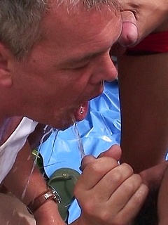White European guy gives blow jobs to three sexy Asian lads at the park.
