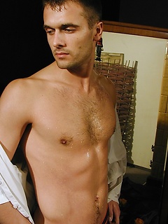 Ripped stud Ronny strokes his cock on the bed.
