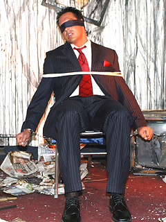 Marcello is tied up in a burnt out house by a masked man, who then apologises by licking his feet and sucking his big hard cock