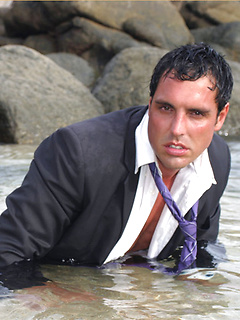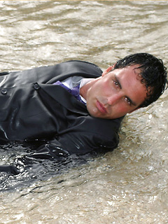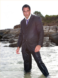 Marcello wearing a soaking wet business suit wanking on the rocks