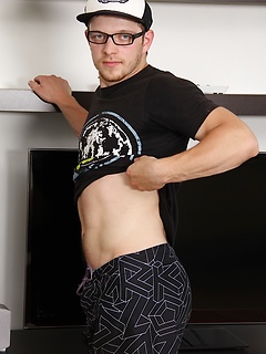Lucas Solowski busts a nut onto his tan lined chest.
