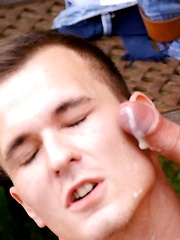New hung guy Dylan Thompson rides the 8" cock of Dominic Belko and gets a messy facial