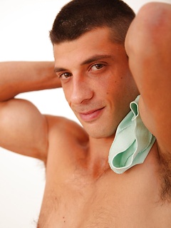 Jonah Kale flexes his muscles and then flexes his hard cock.