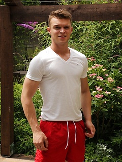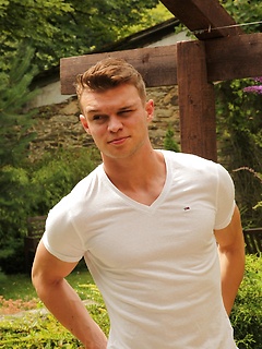 Hard bodied Justin Lovers strokes his cock outdoors.