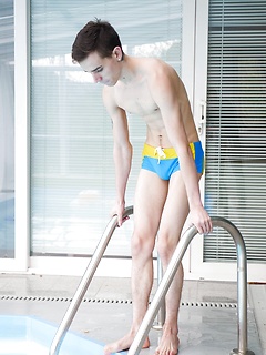 Russian twink Vitali Kutcher floats in the pool with a hard cock.