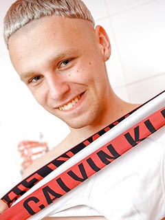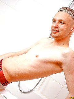 Stroking uncut teen cock in the shower